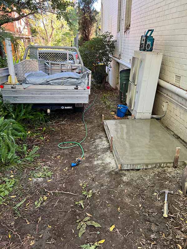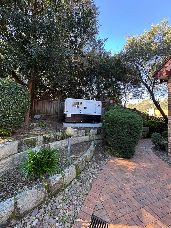 This home standby generator installation for a Pramac GDW35 diesel unit in West Pennant Hills featured careful planning and precise execution to fit the sloped backyard terrain. The team conducted a site inspection to select the ideal spot for ventilation and access, then prepared the area by forming and pouring a solid concrete slab on the terraced level.